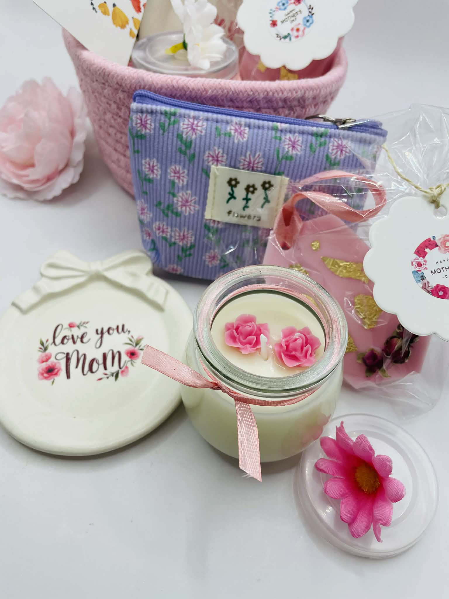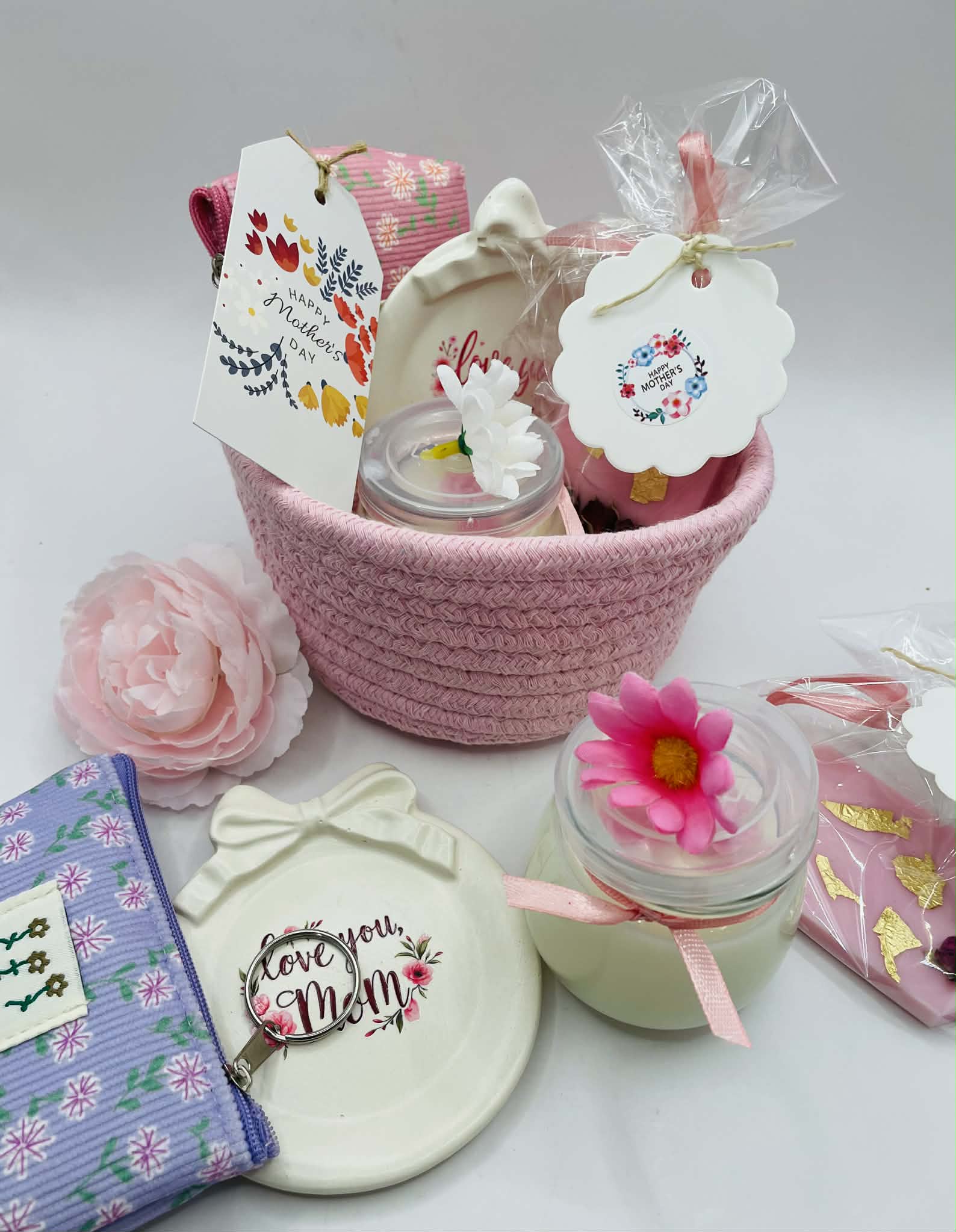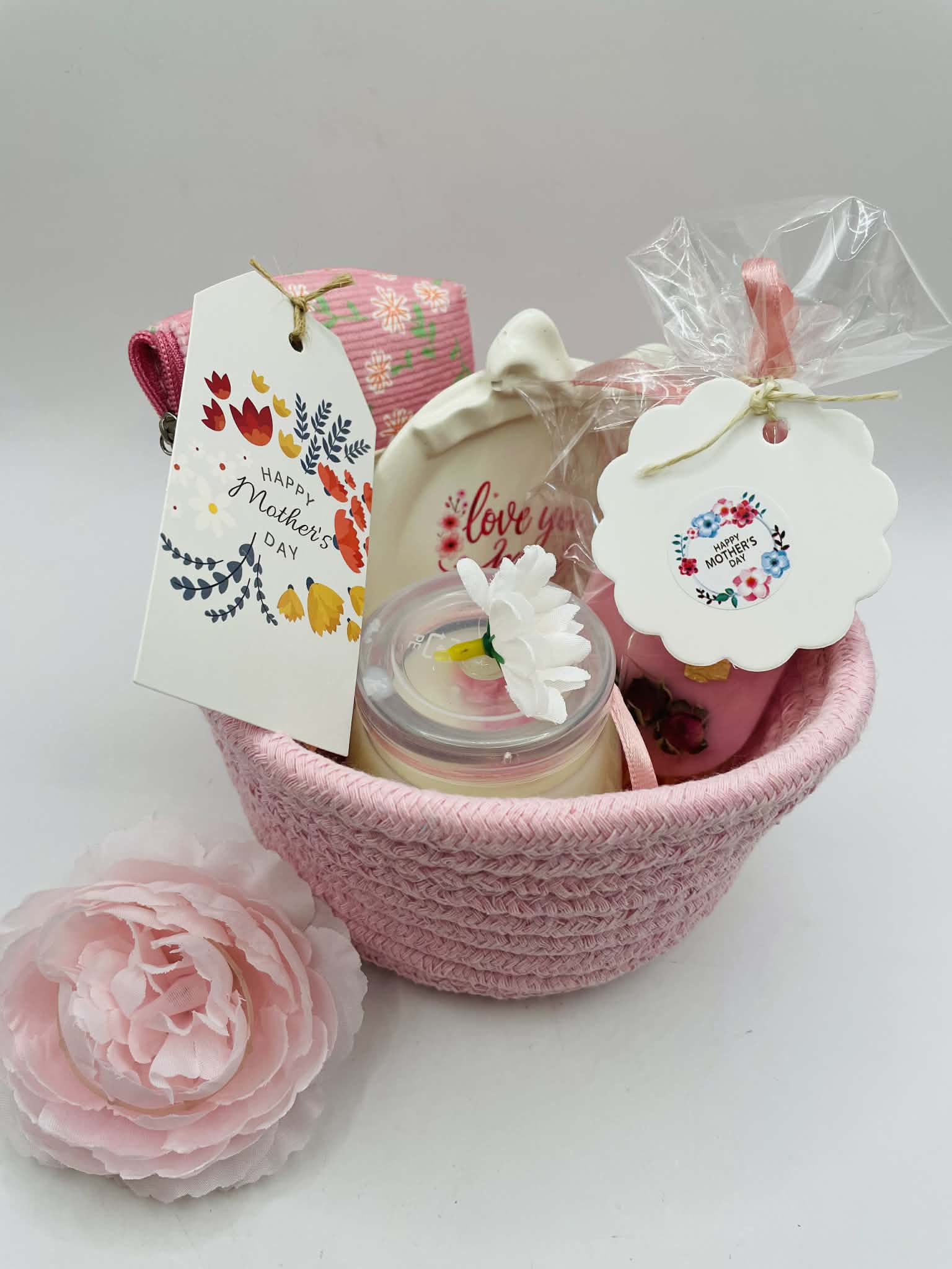 Rózsaszín fonalkosárka, amiben kedves meglepetéseket találsz. Kompakt ajándékcsomag, ha valami egyedi ajándékkal lepnéd meg édesanyádat, nagymamádat.