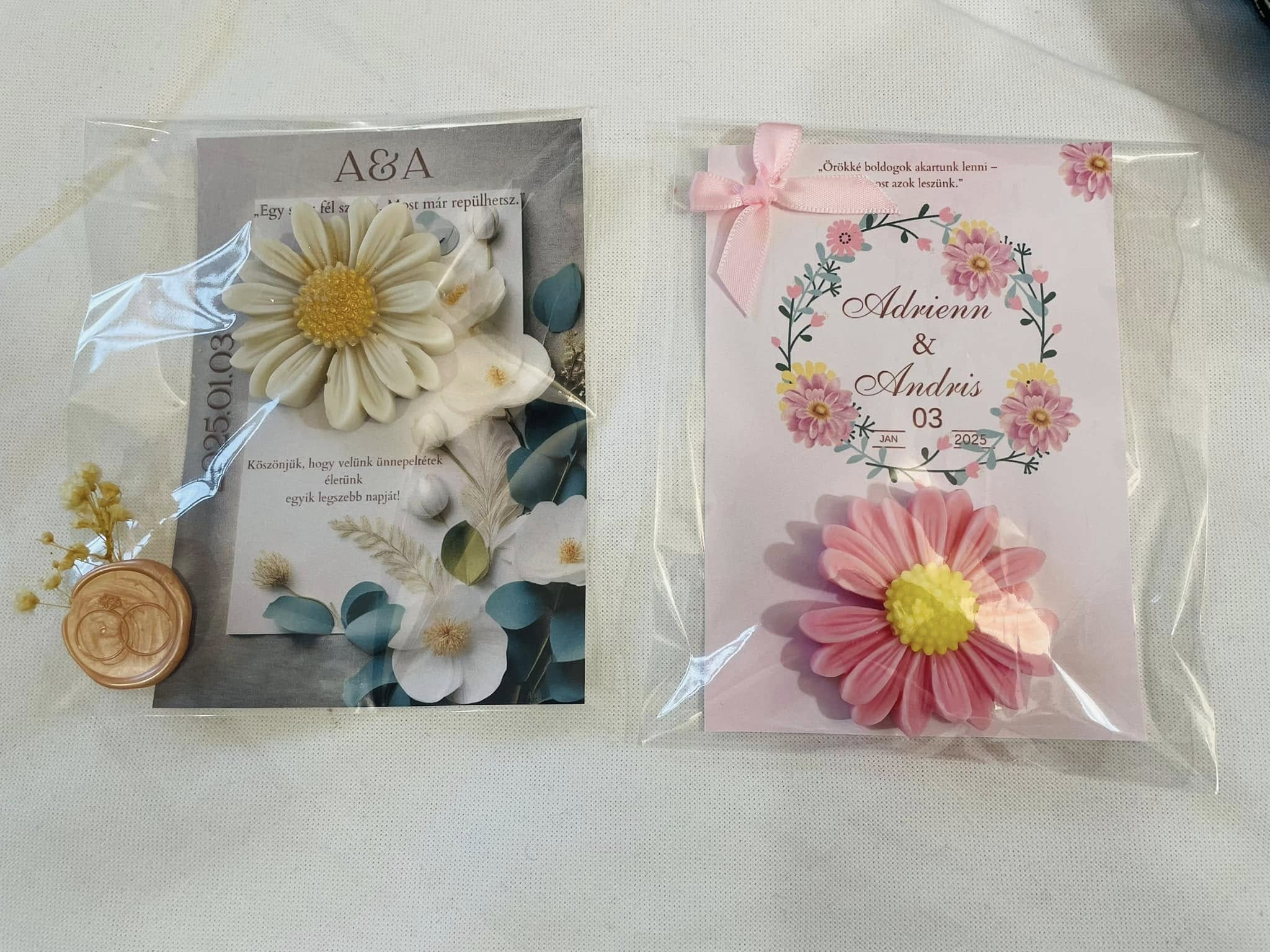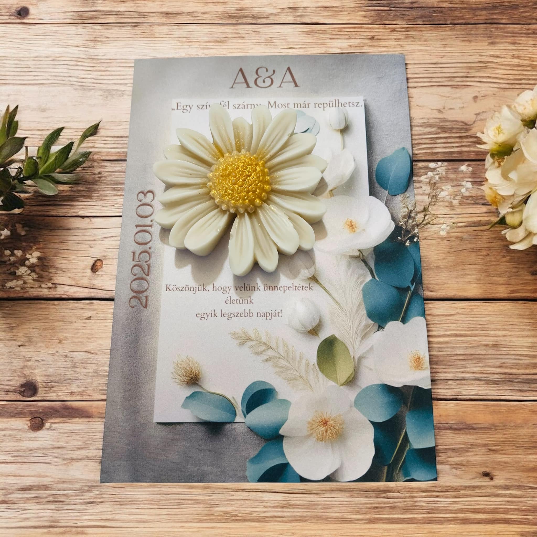 Egy részletgazdag margaréta virág illatviasz, mely színeiben egyezik az üdvözlő kártyával. A kártyán lévő szöveg minden része egyedileg módosítható. Az illatviasz színei változtathatóak.